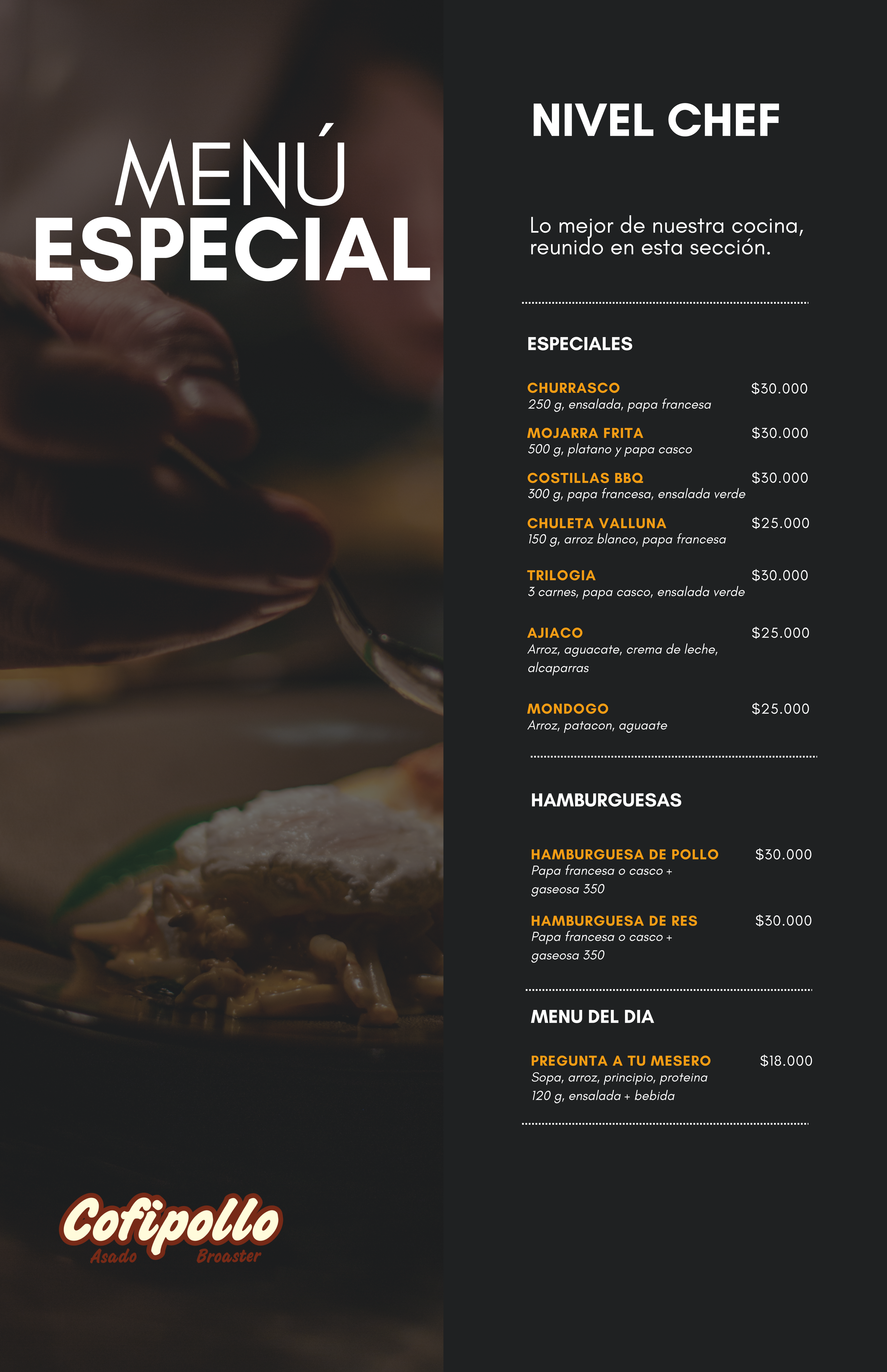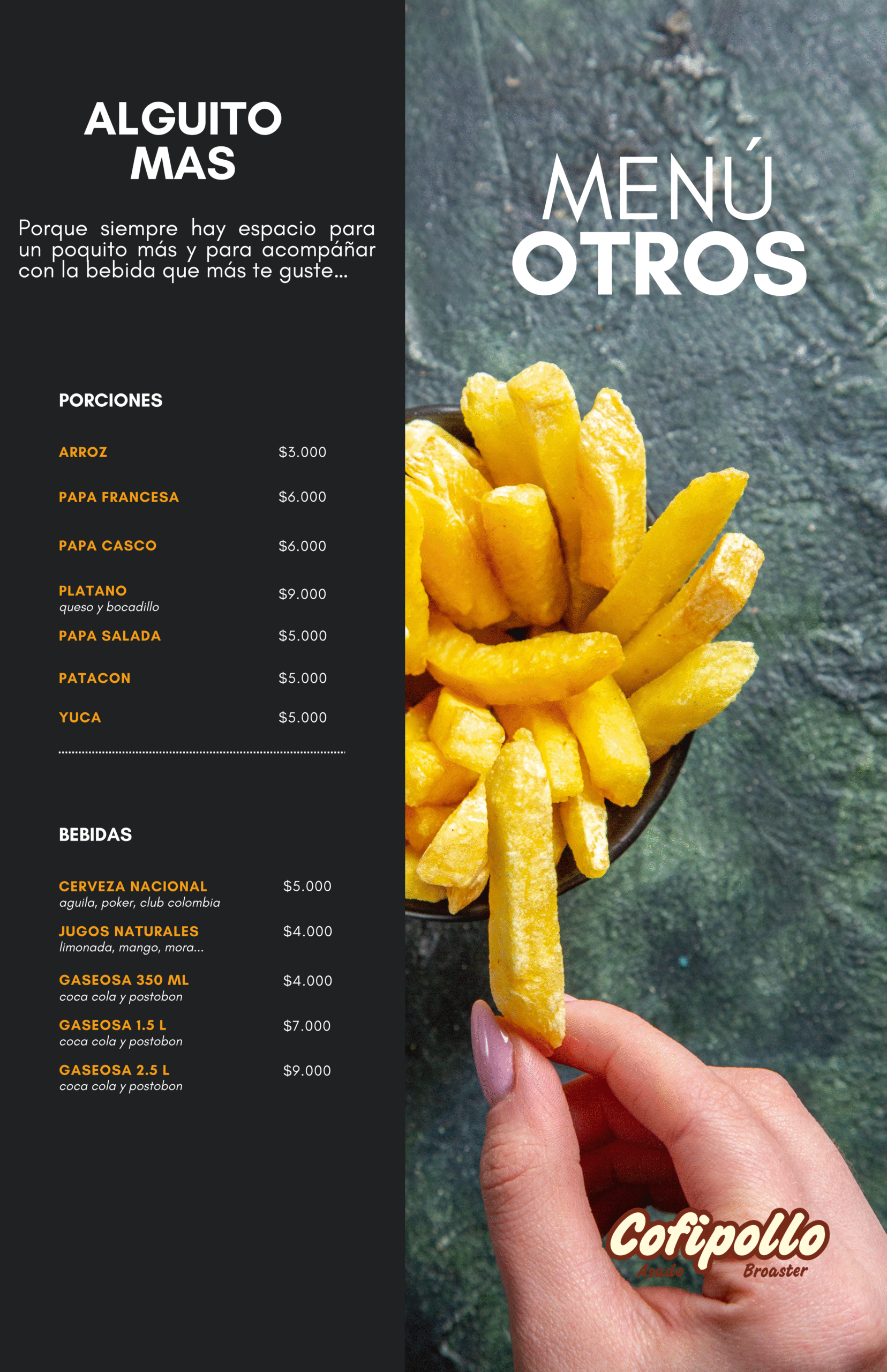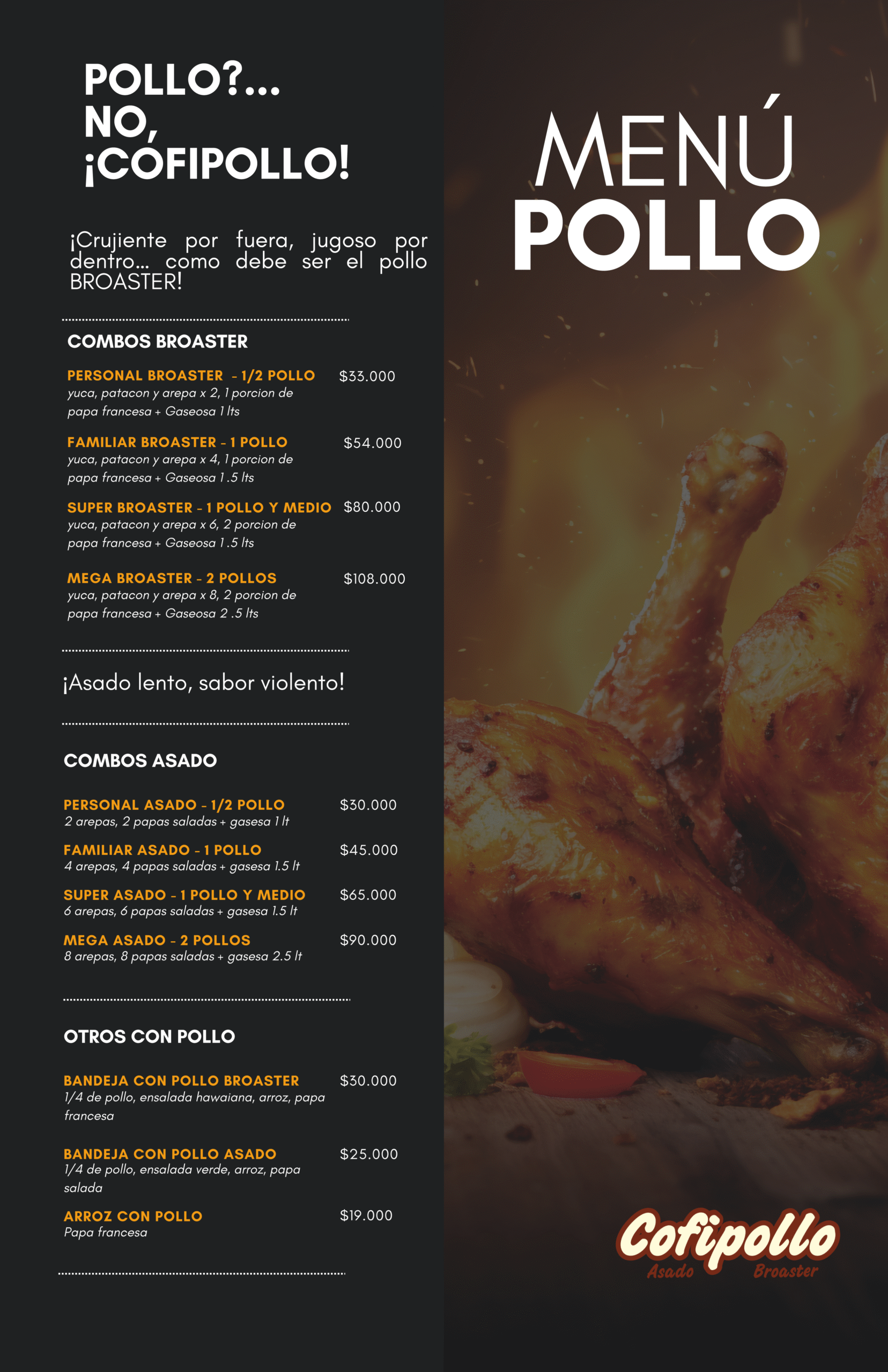 Calle 44 # 50-20 la esmeralda-Teusaquillo – Domicilios al 3015039598 Bienvenidos a: COFIPOLLO ¿Pollo?… No, COFIPOLLO ven a disfrutar de el mejor pollo POLLO ASADO Y BROASTER HELADOS alitas de pollo